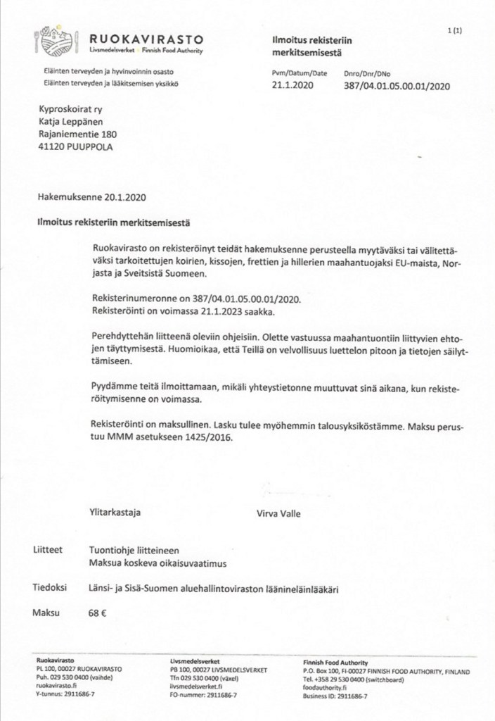 Tuontilupa Kyproskoirat ry on rekisteröitynyt Ruokavirastoon sekä eläinten maahantuojille vaadittavaan TRACES-järjestelmään (rekisterinumero 387/04.01.00.01/2020, voimassa 21.1.2023 saakka). Tykkää Lataa...